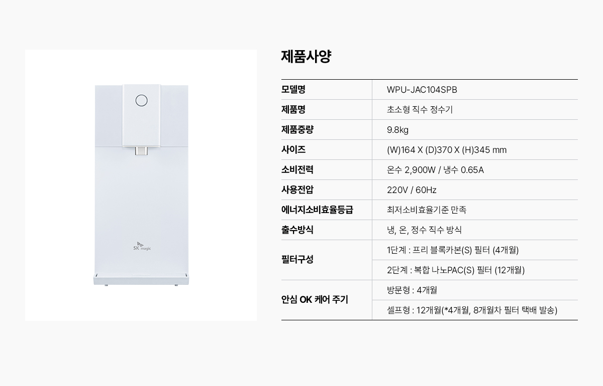 [SK매직] 초소형 직수 정수기 WPU-JAC104SPB 렌탈 / 자가관리 / 의무사용84개월 / 등록설치비면제